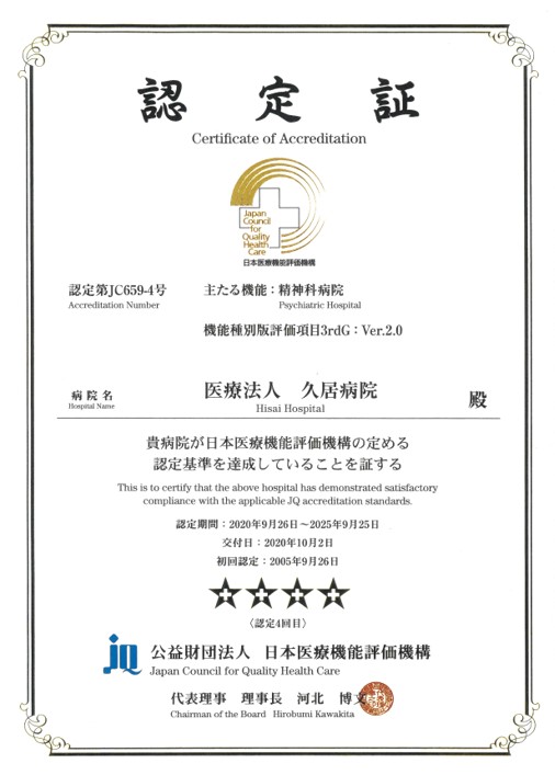 2020年12月1日 / 最終更新日時 : 2020年12月10日 hisai-hospital お知らせ (財)日本医療機能評価機構より4回目の認定を受けました 公益財団法人日本医療機能評価機構による病院機能評価「精神科病院(3rdG:Ver.2.0)」の更新審査を受審し、2020年9月26日付けで認定を受けました。当院においては2005年9月の初回認定以来、今回で4回目の認定となりました。地域の皆さまに安心してご利用いただけるよう、今後も継続して病院機能の向上・医療の質の向上に努めてまいります。 ■病院機能評価とは 医療機関の第三者評価機関である公益財団法人日本医療機能評価機構が、以下の4つの評価対象領域から構成される評価項目を用いて、病院組織全体の運営管理及び提供される医療について評価を行い、一定の水準を満たした病院に対して認定証が交付されるものです。 第1領域「患者中心の医療の推進」 第2領域「良質な医療の実践1」 第3領域「良質な医療の実践2」 第4領域「理念達成に向けた組織運営」 本院が受審した「精神科病院(3rdG:Ver.2.0)」は、主として、精神科医療を担う病院を対象とするものです。 久居病院(Hisai hospital) FacebookXBlueskyCopy