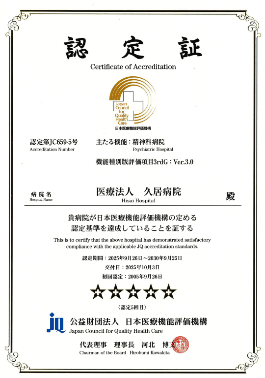 2026年1月20日 / 最終更新日時 : 2026年1月27日 hisai-hospital お知らせ (公財)日本医療機能評価機構より5度目の認定を受けました 公益財団法人日本医療機能評価機構による病院機能評価「精神科病院(3rdG:Ver.3.0)」の更新審査を受審し、2025年9月26日付けで認定を受けました。2005年9月の初回認定以来、当院では5回目の認定となりました。地域の皆さまに安心してご利用いただけるよう、今後も継続して病院機能の向上・医療の質の向上に努めてまいります。 病院機能評価 認定病院とは 医療機関の第三者評価機関である(公財)日本医療機能評価機構が、中立的、科学的、専門的な見地から病院全体の運営管理体制や提供される医療の質について評価を行い、これにより一定の水準を満たしていると認定された病院のことです。以下の4つの評価対象領域から構成される項目で評価されます。 第1領域「患者中心の医療の推進」 第2領域「良質な医療の実践1」 第3領域「良質な医療の実践2」 第4領域「理念達成に向けた組織運営」 本院が受審した「精神科病院(3rdG:Ver.3.0)」は、主として、精神科医療を担う病院を対象とするものです。認定病院は、その証として「認定証」や「認定シンボルマーク」を掲示することができ、利用者様は日本医療機能評価機構のウェブサイトで認定病院の情報を検索することができます。 参考:病院機能評価の情報提供のページhttps://www.report.jcqhc.or.jp/ 久居病院(Hisai hospital) FacebookXBlueskyCopy